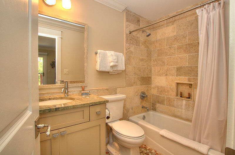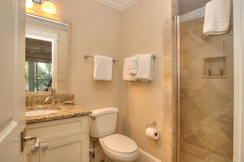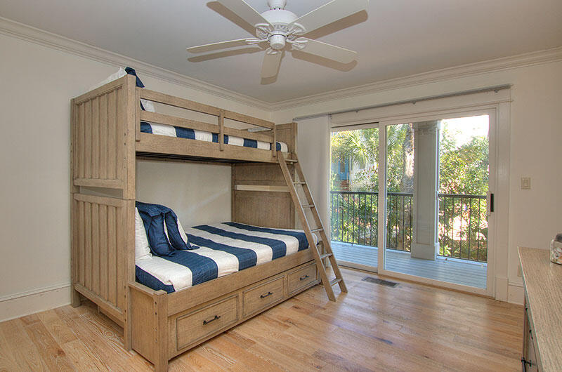 The other 4 bedrooms are located on the first floor. The 1st floor master offers a king bed, hardwood flooring, TV and private bathroom with unique tile work and a shower/tub combination. This room opens through sliding doors to a large covered outdoor seating area with a comfortable cushioned L shaped sofa and lounge chairs. The middle guest bedroom with queen bed provides a gorgeous view of the ocean through the sliding glass doors. There is a TV enclosed in an armoire, and private bathroom with shower/tub combination. The third bedroom on the ocean side has a bunk bed (Twin/Double) with a twin trundle bed and a wall-mounted flat screen TV, as well as a private bath with walk-in shower with stone tile work. All three ocean-oriented bedrooms have easy sliding door access to the outdoor seating area. The final bedroom on the first floor is a front-facing bedroom with a queen bed and twin trundle. This bedroom also boasts a wall-mounted flat screen TV and private bathroom with walk-in shower.