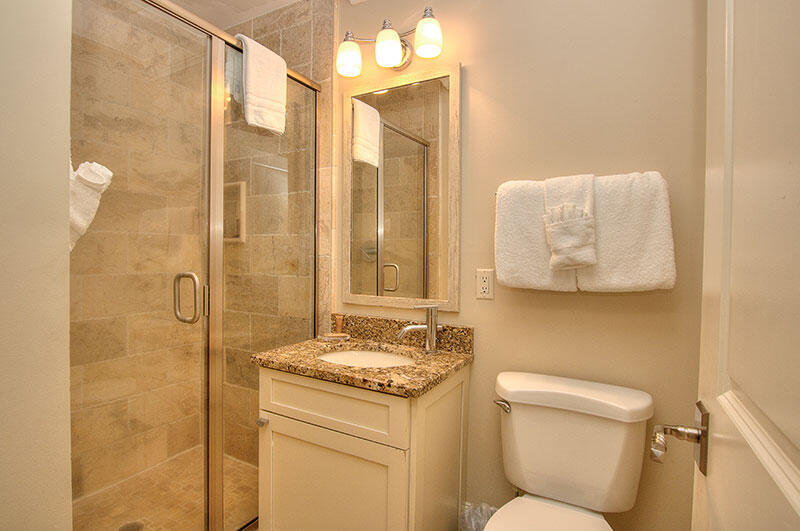 The main living space is located on the 2nd floor with living room and 65" mounted TV, dining room, kitchen and separate sitting area with oversized chairs that convert to twin sleepers. A master suite located on the 2nd level features a king size bed, large wrap-around windows and upscale stone-topped furnishings. The elegant en suite bathroom offers a pair of vanities with artistic glass basins, a whirlpool bathtub set in stone tile, and a custom-tiled glass-walled walk-in shower with rainfall showerhead.